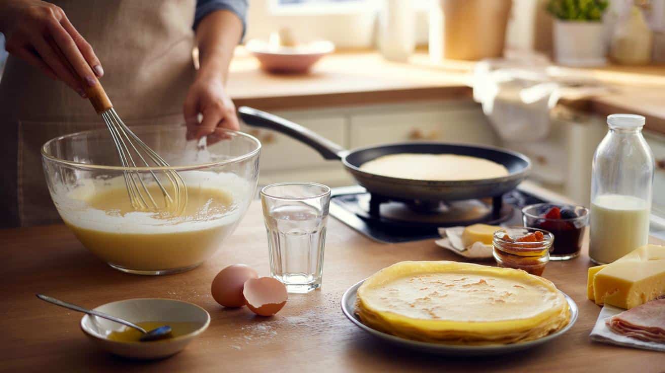 Cover the bowl and leave the batter to rest for about an hour at room temperature. During this pause, the flour hydrates fully and the gluten relaxes, giving a softer, more flexible crêpe.
